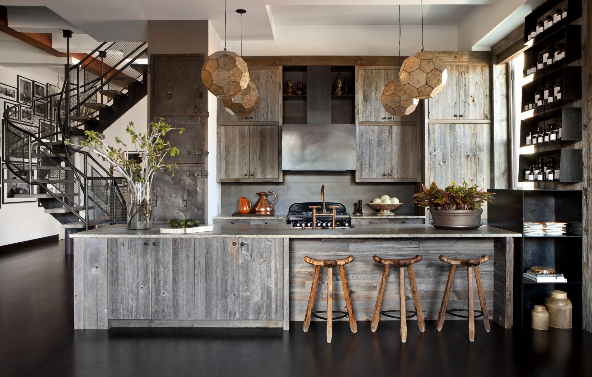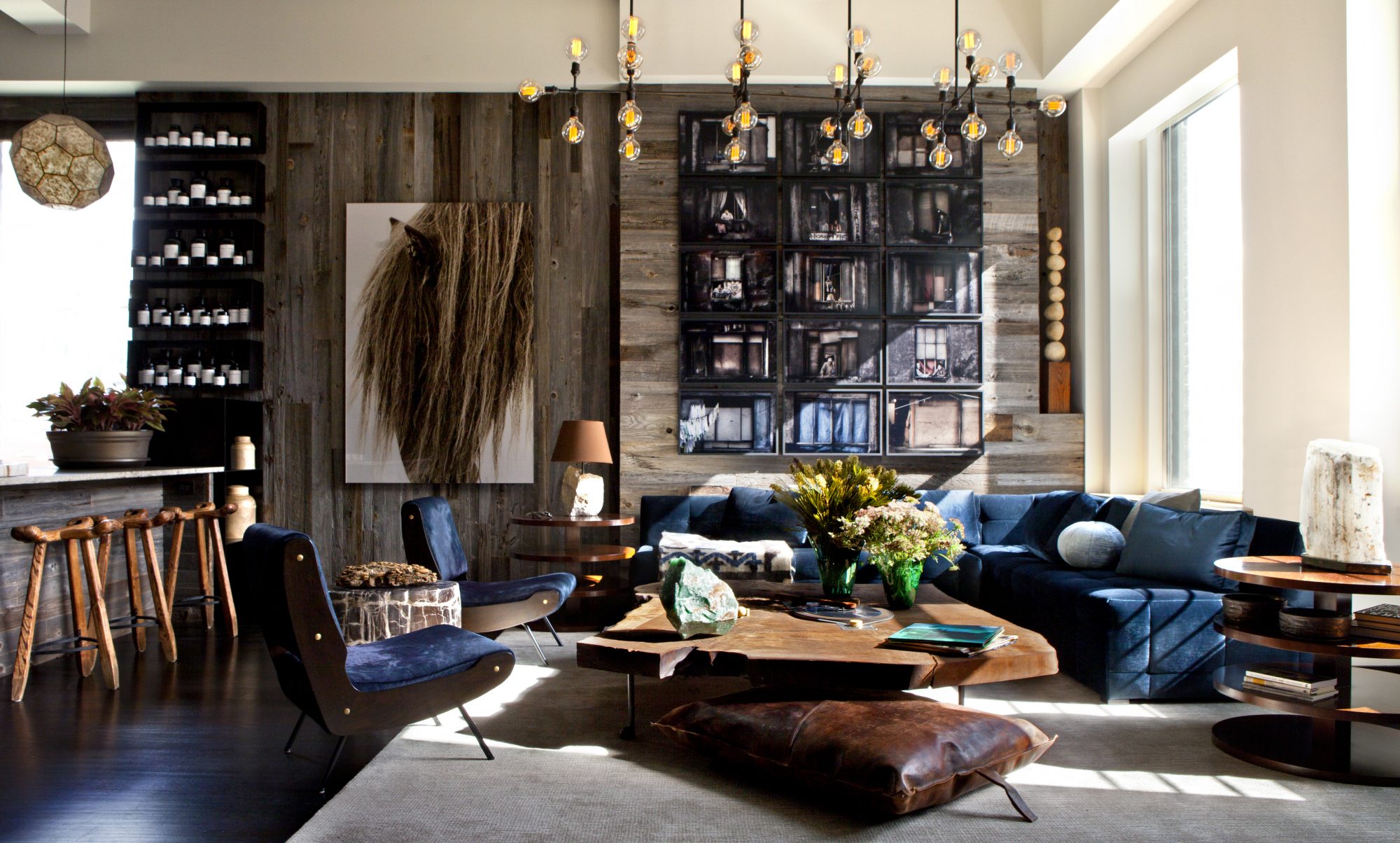 Bond Street was a partial gut renovation, reconfiguring the public areas and master suite and rooftop areas while integrating steel structural elements with reclaimed wood from barns. The bathrooms and kitchen run off a custom water filtration system. The master bathroom shower is uniquely open, with a Japanese wood tub in the center.