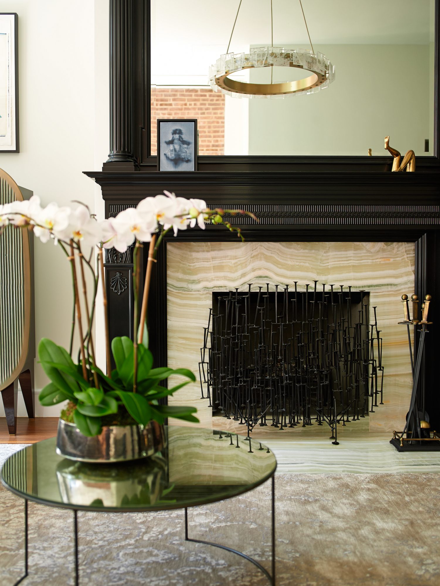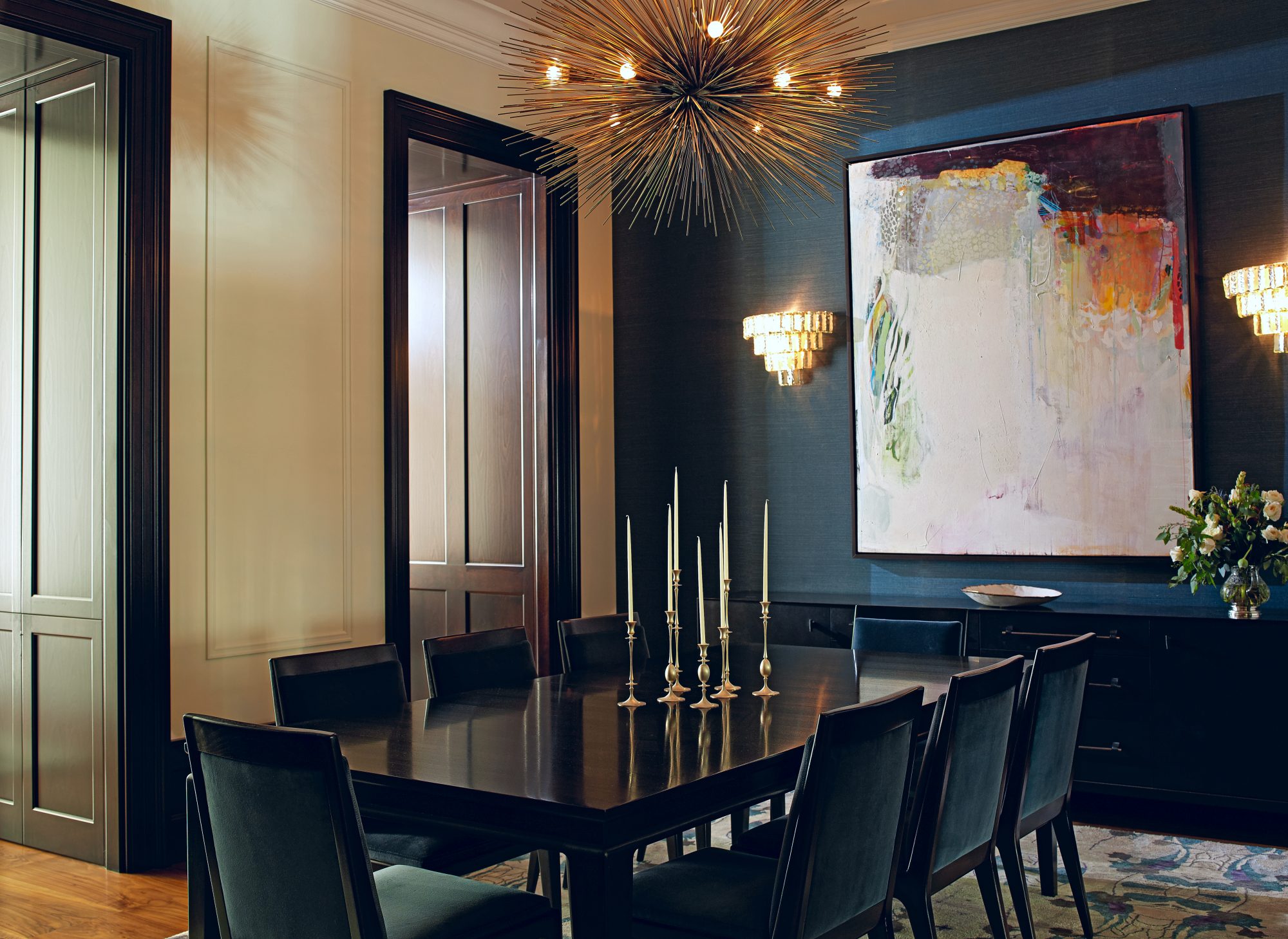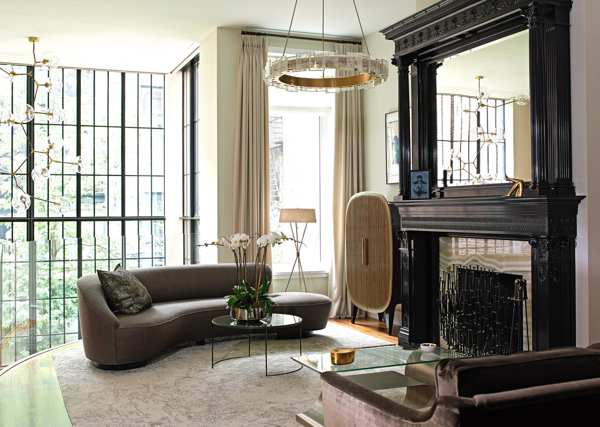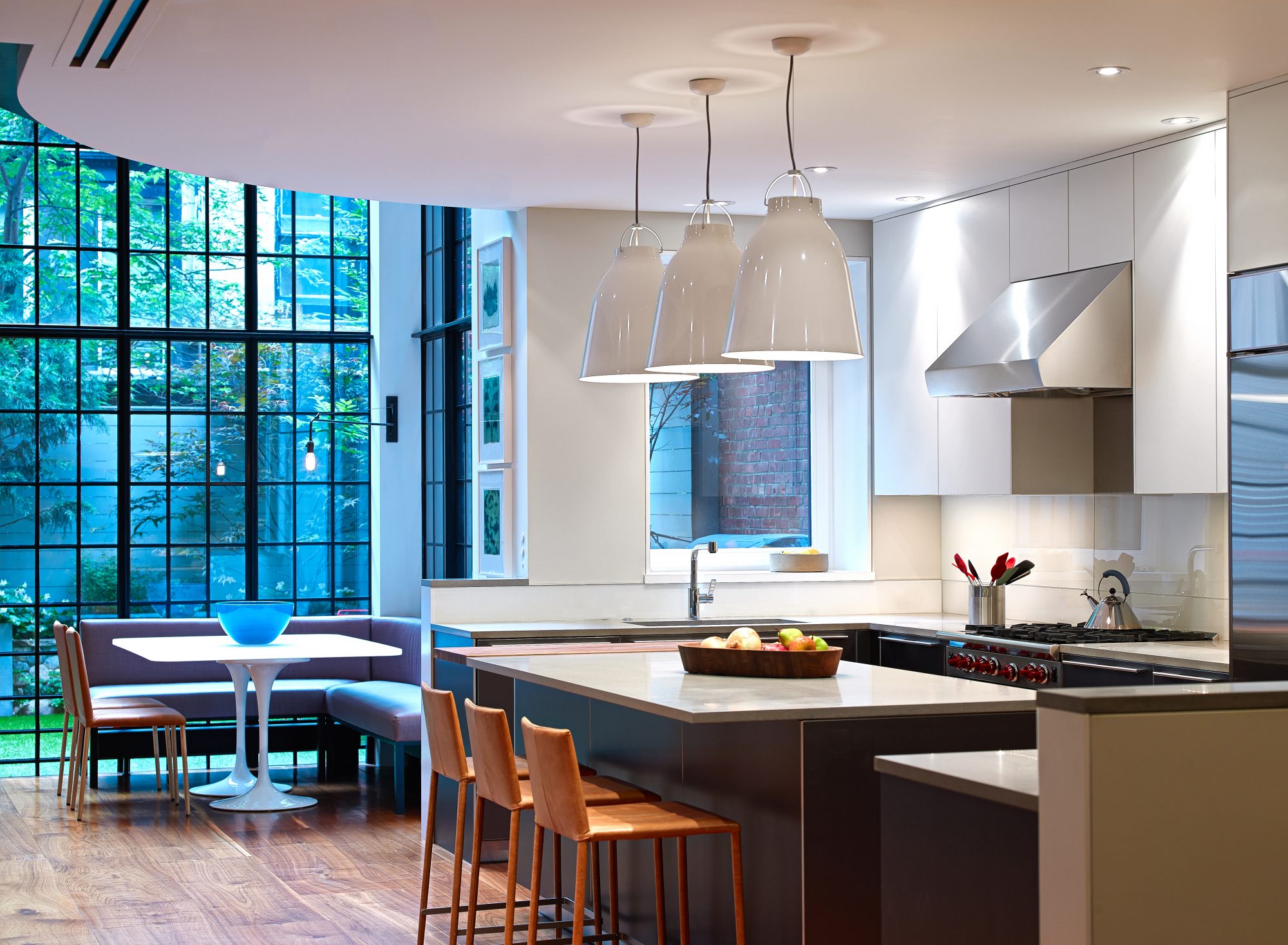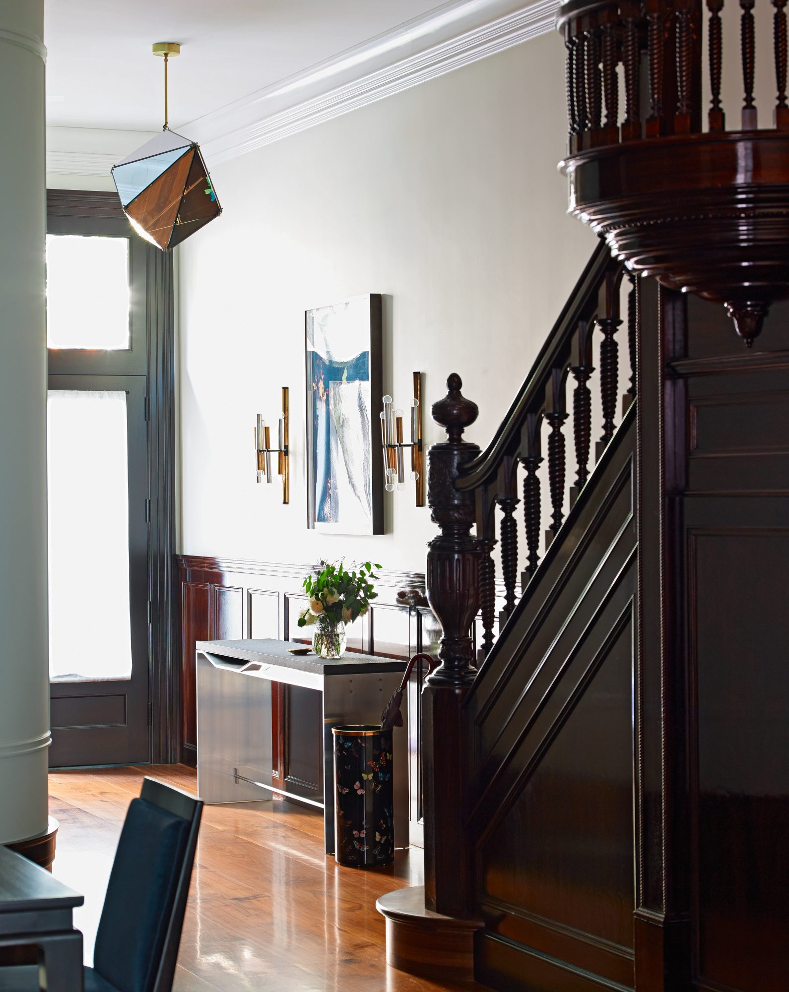 This 10,000-square-foot brownstone residence was a complete gut, including excavating 13 feet deep in the cellar and adding an entire steel skeleton. The back of the building was removed and reconfigured to allow for a backyard and a 26-foot-tall curtain wall of glass. The front of the building was restored to its original glory with the addition of a proper stoop, with matching historical details. To help maintain the spirit, the original parlor-level staircase was refurbished with new steel supports, and the office furniture was fabricated using reclaimed wood from the original house.
